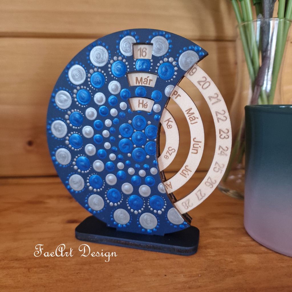 Kézzel festett fa öröknaptár. A hónap, nap illetve a hét napja beállítható, könnyen forgatható. A fa alapanyag is hazai készítőtől származik.